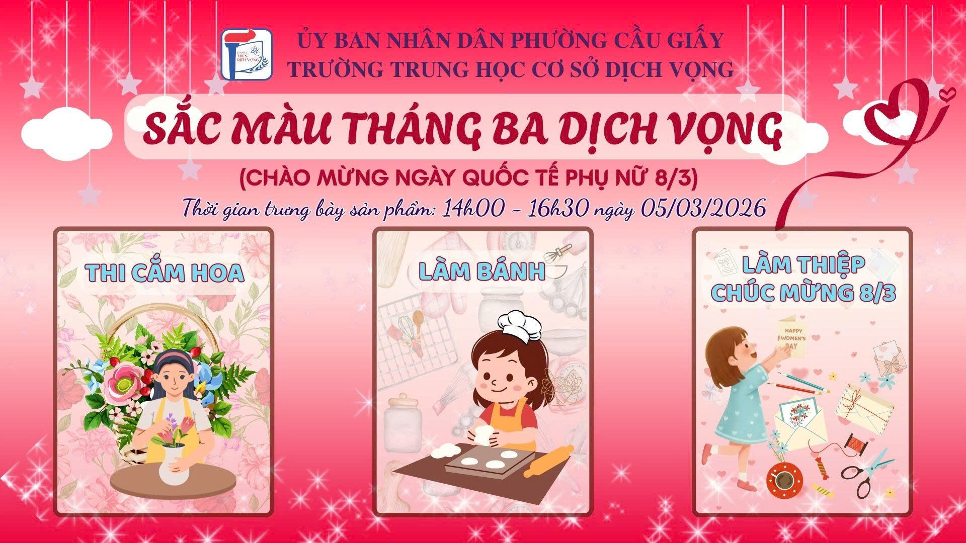 👏Tháng Ba yêu thương đã gõ cửa, mang theo sắc xuân rực rỡ và không khí háo hức lan tỏa khắp sân trường. Ngày Quốc tế Phụ nữ 8/3 năm nay tại THCS Dịch Vọng hứa hẹn sẽ thật đặc biệt với chuỗi hoạt động đầy màu sắc, sáng tạo và tràn ngập niềm vui!!!