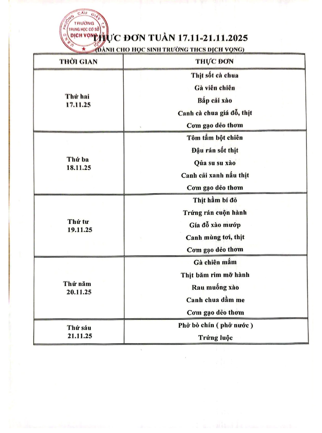 Trường THCS Dịch Vọng công khai thực đơn bán trú học sinh tuần 17/11 - 21/11/2025 như sau: