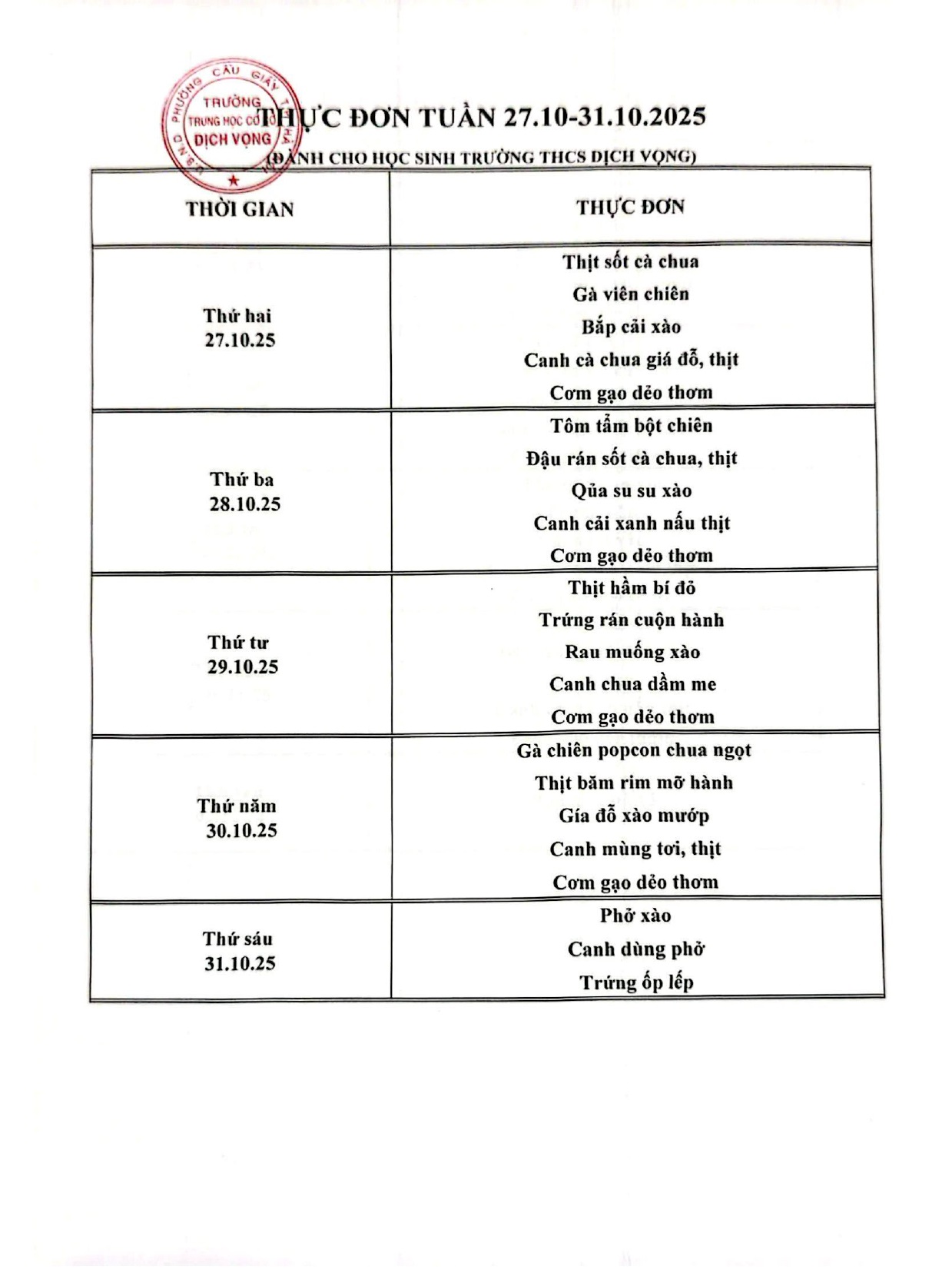 Trường THCS Dịch Vọng công khai thực đơn bán trú học sinh tuần 27/10 - 31/10/2025 như sau: