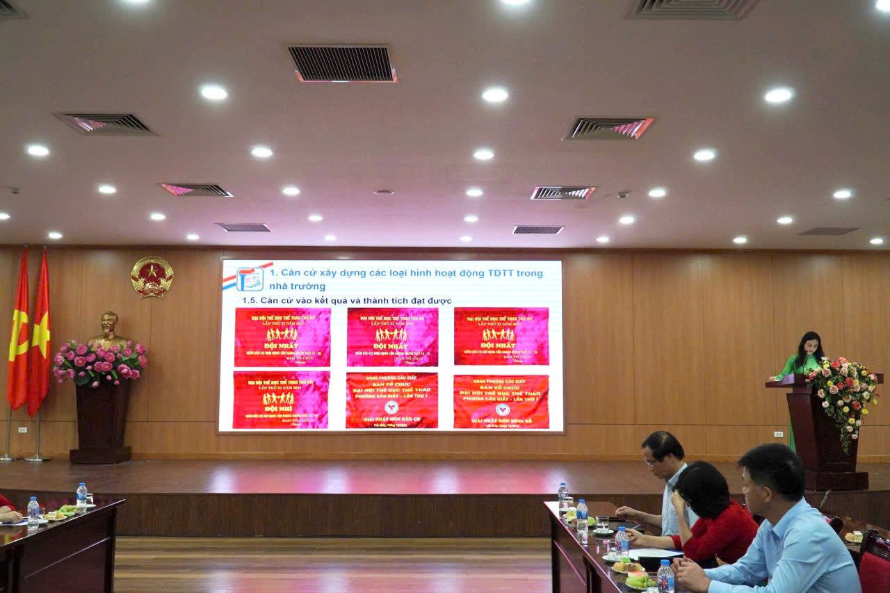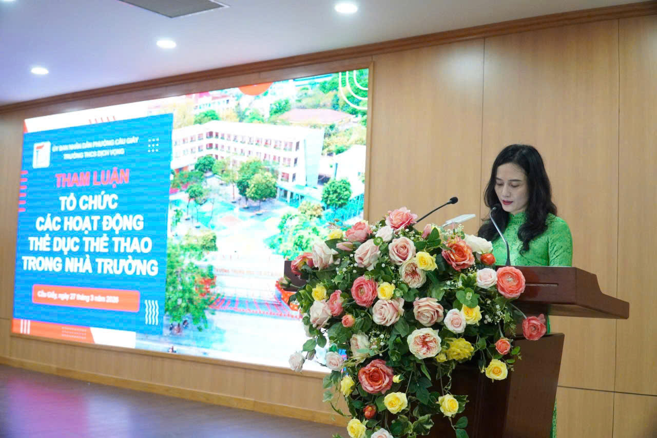 🌟 Đặc biệt, Trường THCS Dịch Vọng vinh dự có TS. Phạm Thị Như Hoa - Bí thư Đảng ủy, Hiệu trưởng nhà trường tham gia trình bày tham luận, chia sẻ kinh nghiệm tổ chức các hoạt động thể dục, thể thao trong nhà trường. Nội dung tham luận nhấn mạnh việc đa dạng hóa hình thức tổ chức như: kết hợp hoạt động chính khóa – ngoại khóa – câu lạc bộ; duy trì phong trào thể dục giữa giờ; lồng ghép trò chơi dân gian; phát triển các câu lạc bộ thể thao cho cả học sinh và giáo viên. Qua đó góp phần xây dựng môi trường giáo dục toàn diện, nơi học sinh không chỉ phát triển thể chất mà còn hình thành ý chí, tinh thần đoàn kết và kỹ năng sống tích cực.
