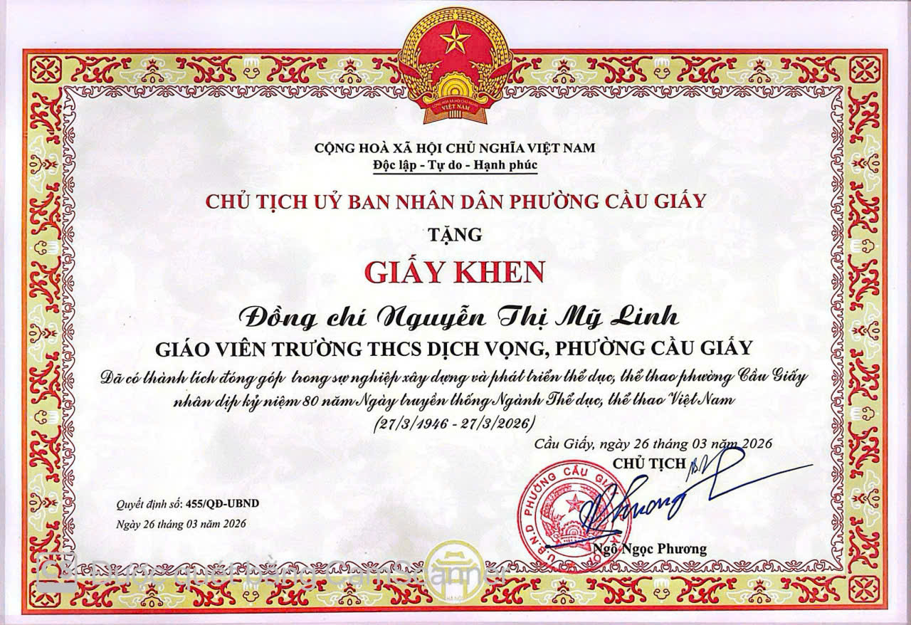 ⚜️ Ghi nhận những đóng góp của tập thể, cá nhân trên địa bàn phường, tập thể trường THCS Dịch Vọng, cô giáo Nguyễn Thị Mỹ Linh - Tổ trưởng tổ GDTC-NT và thầy giáo Trần Vũ Thành An- Giáo viên tổ GDTC-NT đã vinh dự nhận Giấy khen của Chủ tịch UBND phường Cầu Giấy “đã có thành tích đóng góp trong sự nghiệp xây dựng và phát triển thể dục, thể thao phường Cầu Giấy nhân dịp kỉ niệm 80 năm Ngày truyền thống Ngành Thể dục, thể thao Việt Nam (27/3/1946 – 27/3/2026)”. Đây là sự ghi nhận xứng đáng cho những nỗ lực, tâm huyết và tinh thần cống hiến không ngừng của các thầy cô.