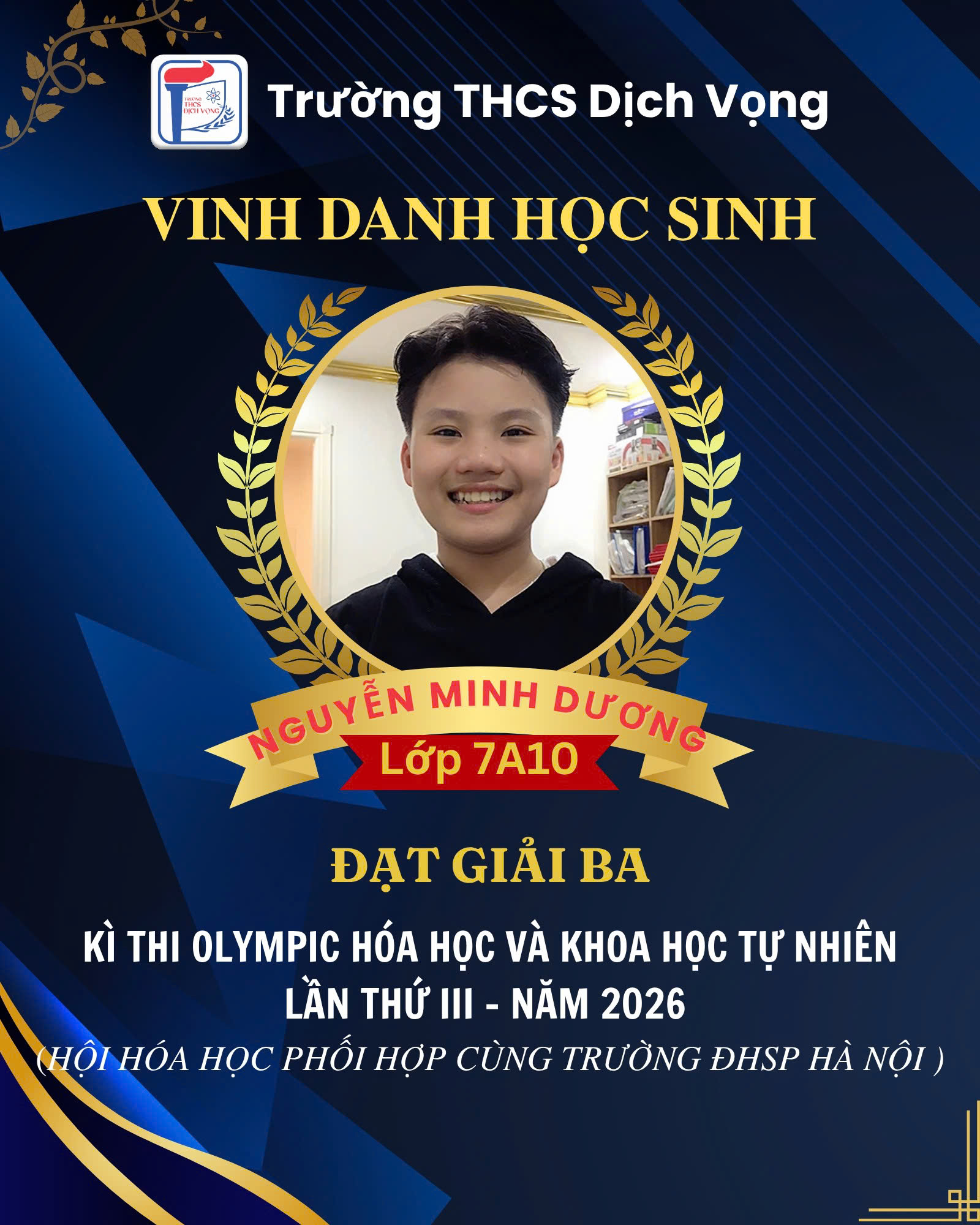 💡 Thành tích của các em không chỉ là niềm tự hào của gia đình và nhà trường mà còn là minh chứng cho chất lượng giáo dục, sự tận tâm của thầy cô cùng tinh thần nỗ lực bền bỉ của học sinh Trường THCS Dịch Vọng.