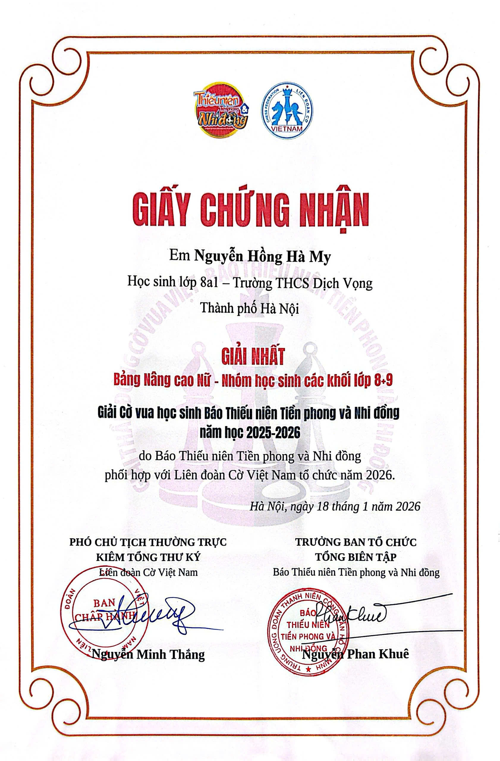 🌺🌺🌺Nhà trường chúc mừng thành tích của em Nguyễn Hồng Hà My, đây là một thành tích đáng tự hào và là một tấm gương sáng lan tỏa tinh thần rèn luyện tư duy, tính kỷ luật, bản lĩnh thi đấu và khả năng sáng tạo của học sinh trường THCS Dịch Vọng.
