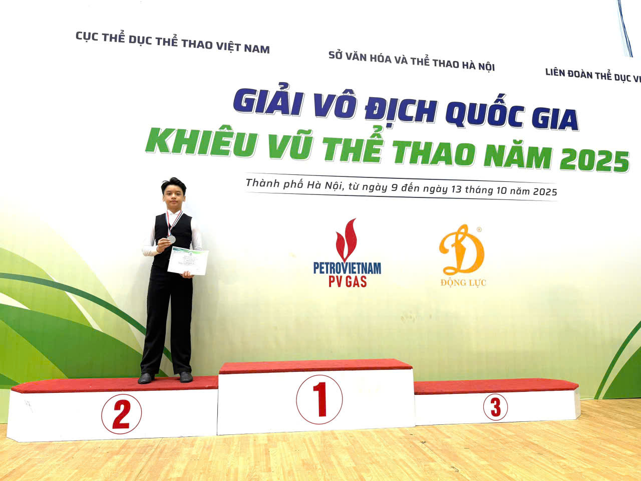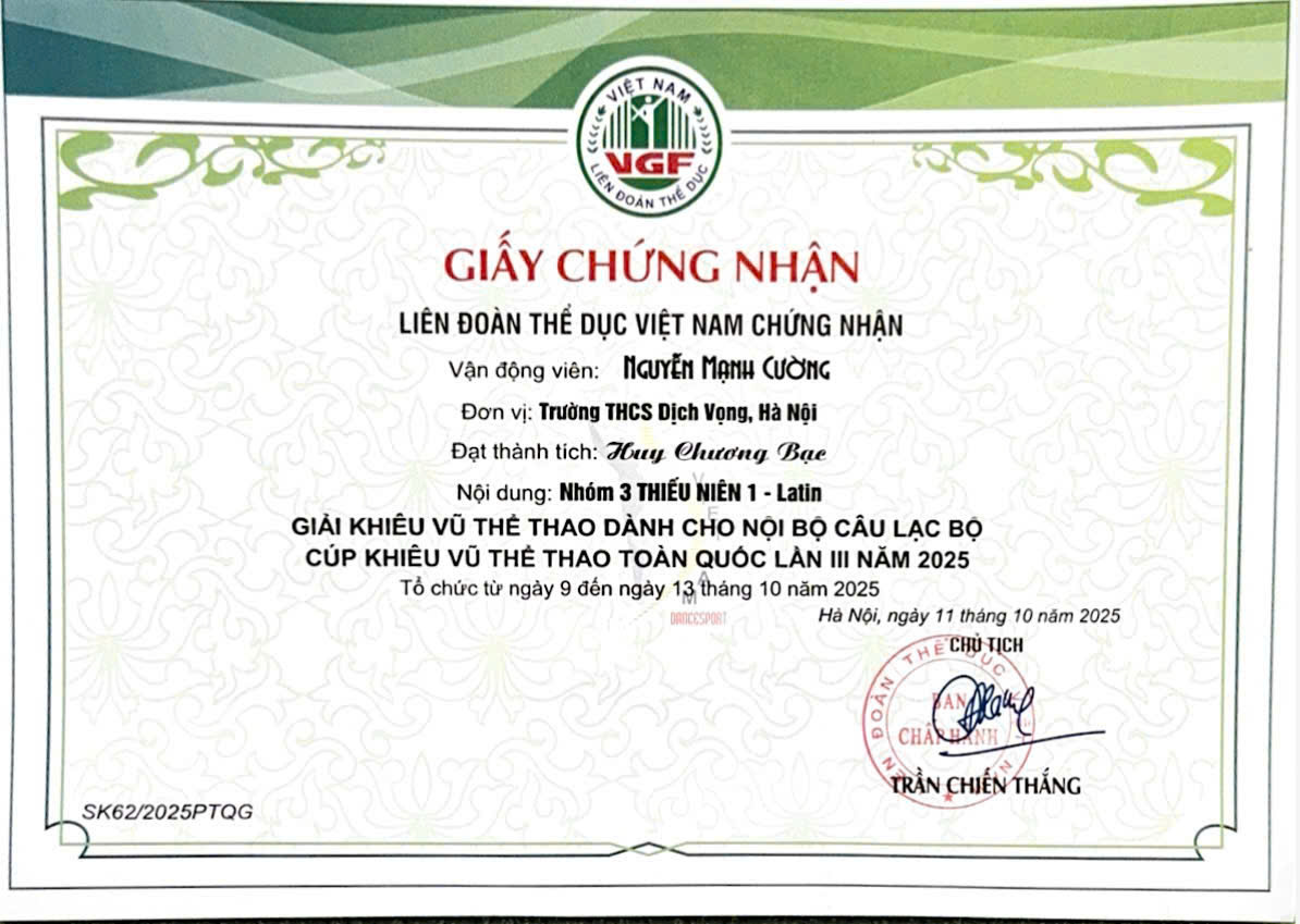 🎉🎉🎉 Chúc mừng em Nguyễn Mạnh Cường – học sinh lớp 7A1, Trường THCS Dịch Vọng đã xuất sắc giành Huy chương Bạc nội dung Nhóm 3 Thiếu niên 1 – Latin tại Giải Khiêu vũ thể thao toàn quốc lần III năm 2025 do Liên đoàn Thể dục Việt Nam tổ chức! 🎉