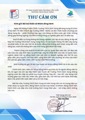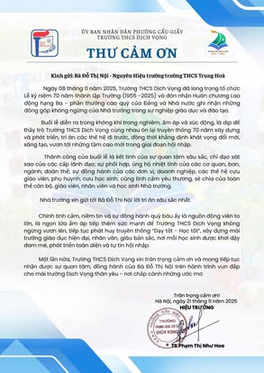 THCS DỊCH VỌNG TRÂN TRỌNG CẢM ƠN NHÂN DỊP KỶ NIỆM 70 NĂM NGÀY THÀNH LẬP TRƯỜNG
