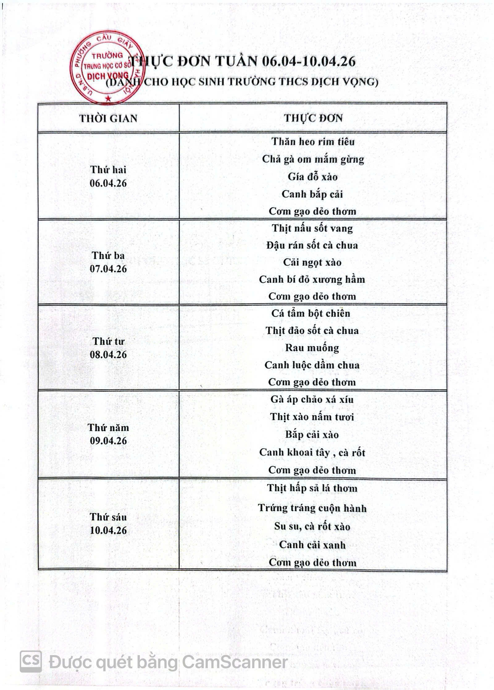 Trường THCS Dịch Vọng công khai thực đơn bán trú học sinh tuần 06/04/2026 - 10/04/2026 như sau:
