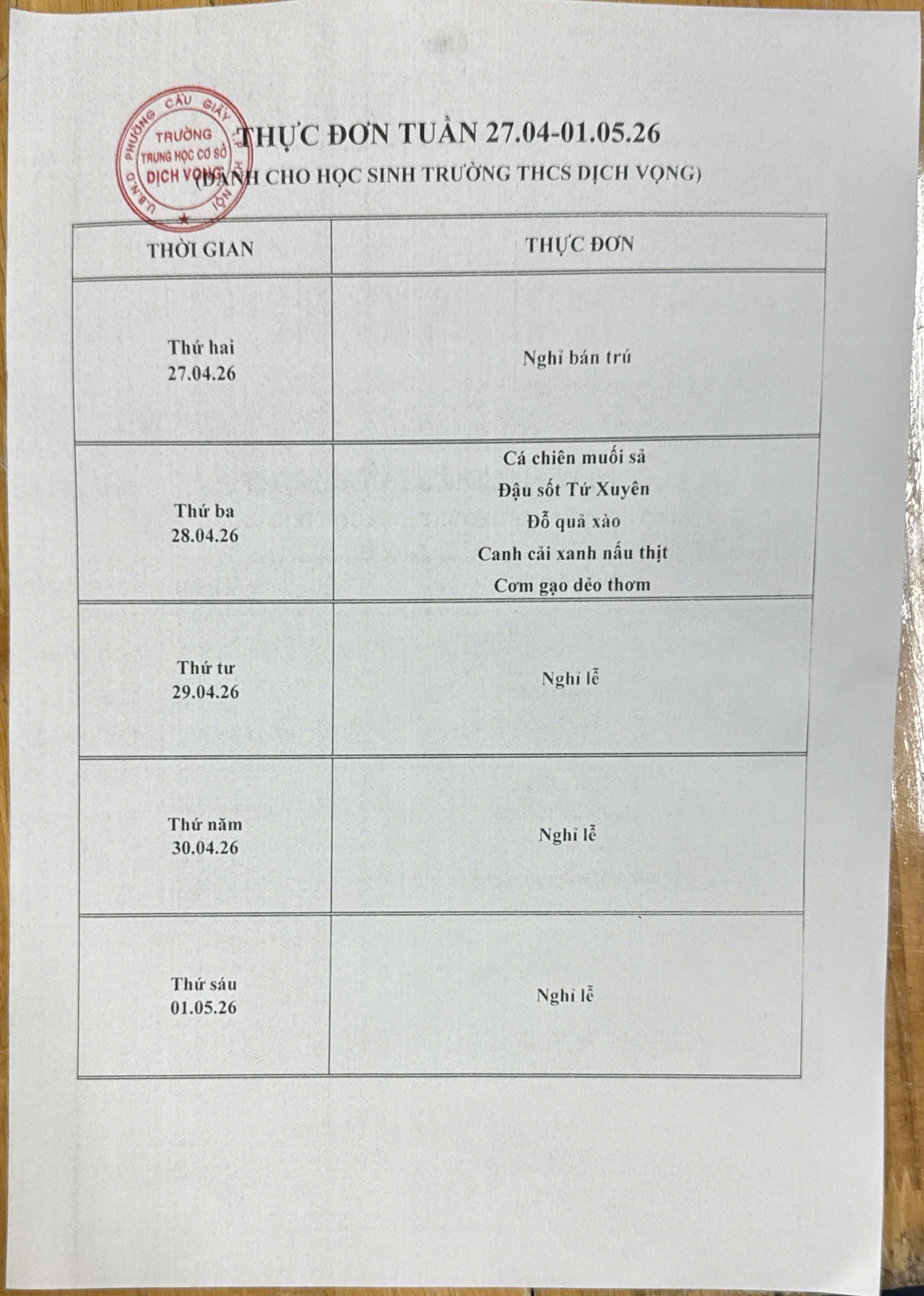 Trường THCS Dịch Vọng công khai thực đơn bán trú học sinh tuần 27/04/2026 - 01/05/2026 như sau: