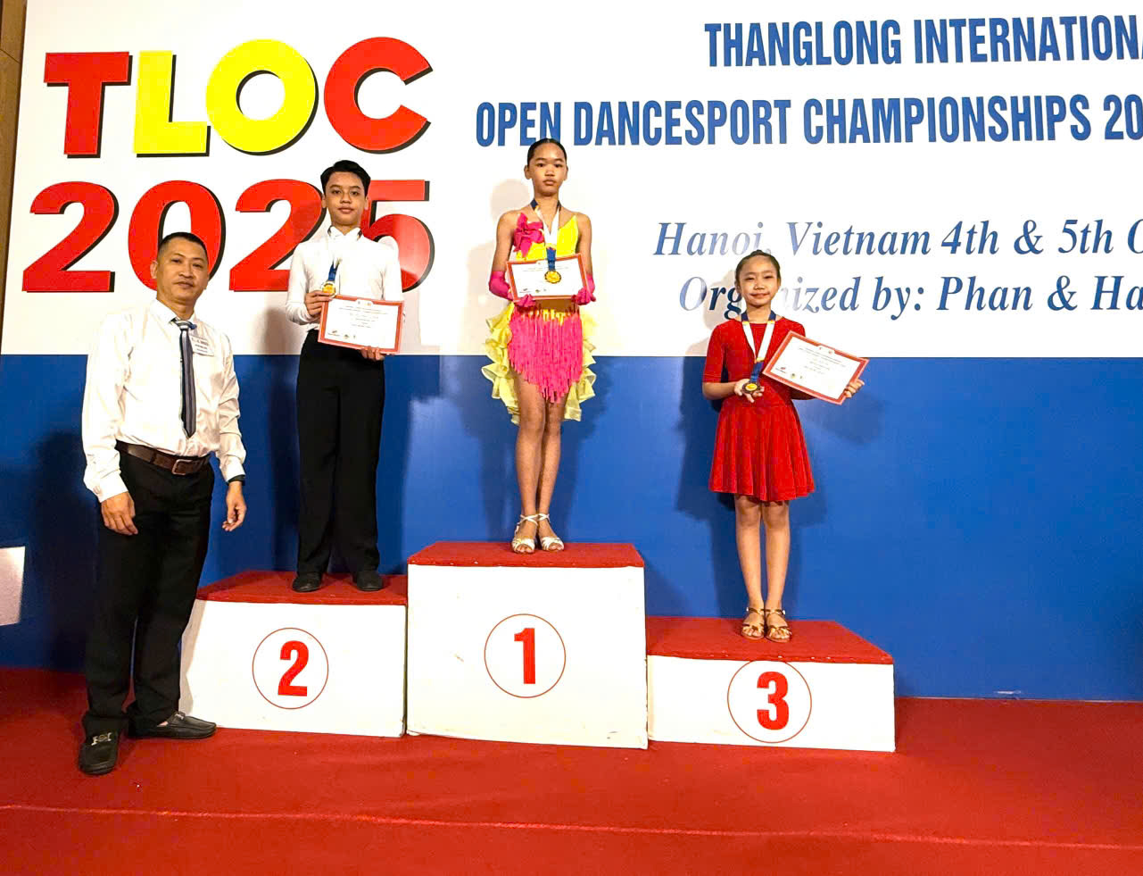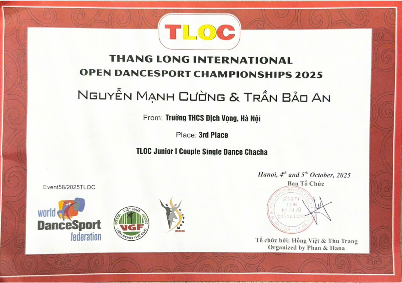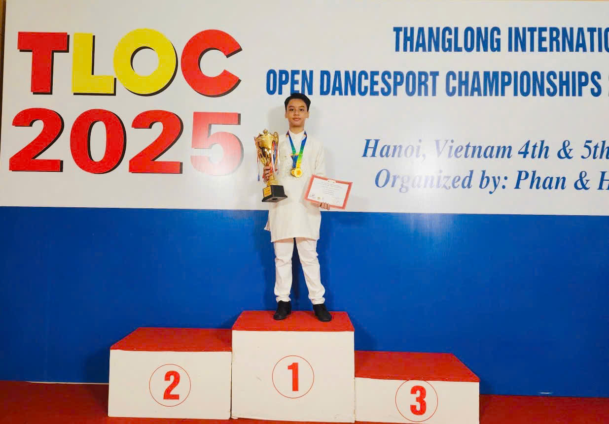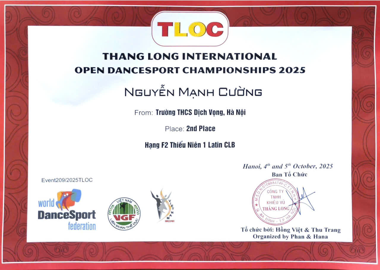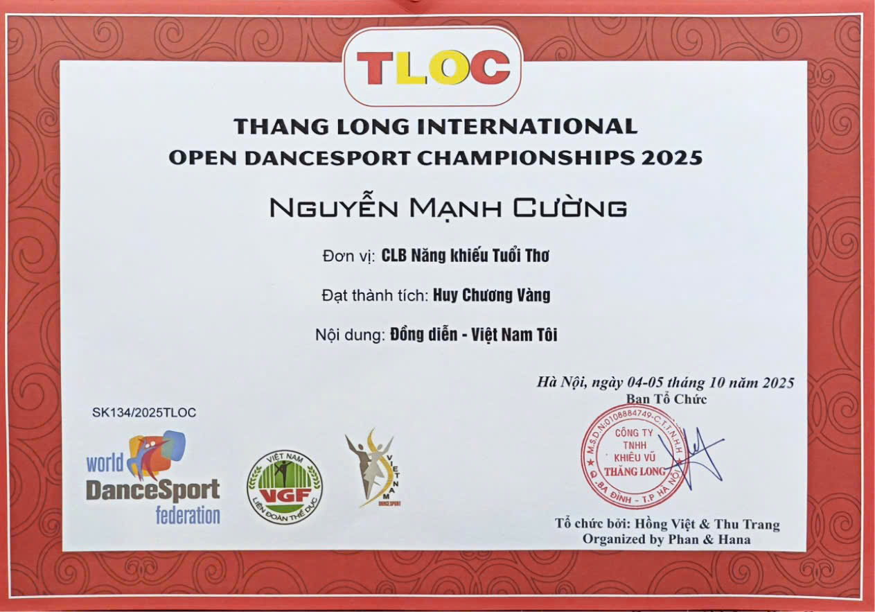 📍Vào ngày 04-5/10/2025 vừa qua, giải Khiêu vũ Thể thao " THANG LONG INTERNATIONAL OPEN DANCESPORT CHAMPIONSHIPS 2025" được tổ chức tại Hà Nội đã quy tụ nhiều các VĐV quốc tế đến từ Trung Quốc, Hồng Kong, Philipin, Singapore, Malaisia, Việt Nam..., trong đó có em Nguyễn Mạnh Cường tham gia. Với sự nỗ lực của bản thân, em đã đạt được những thành tích rực rỡ: