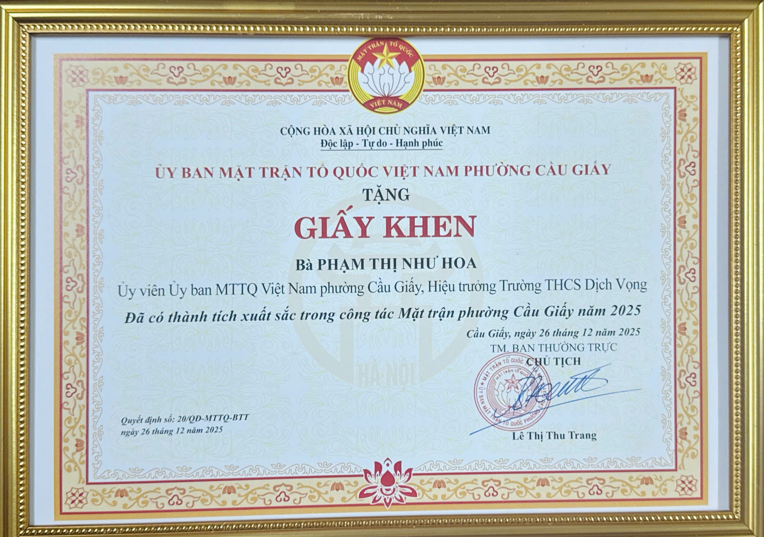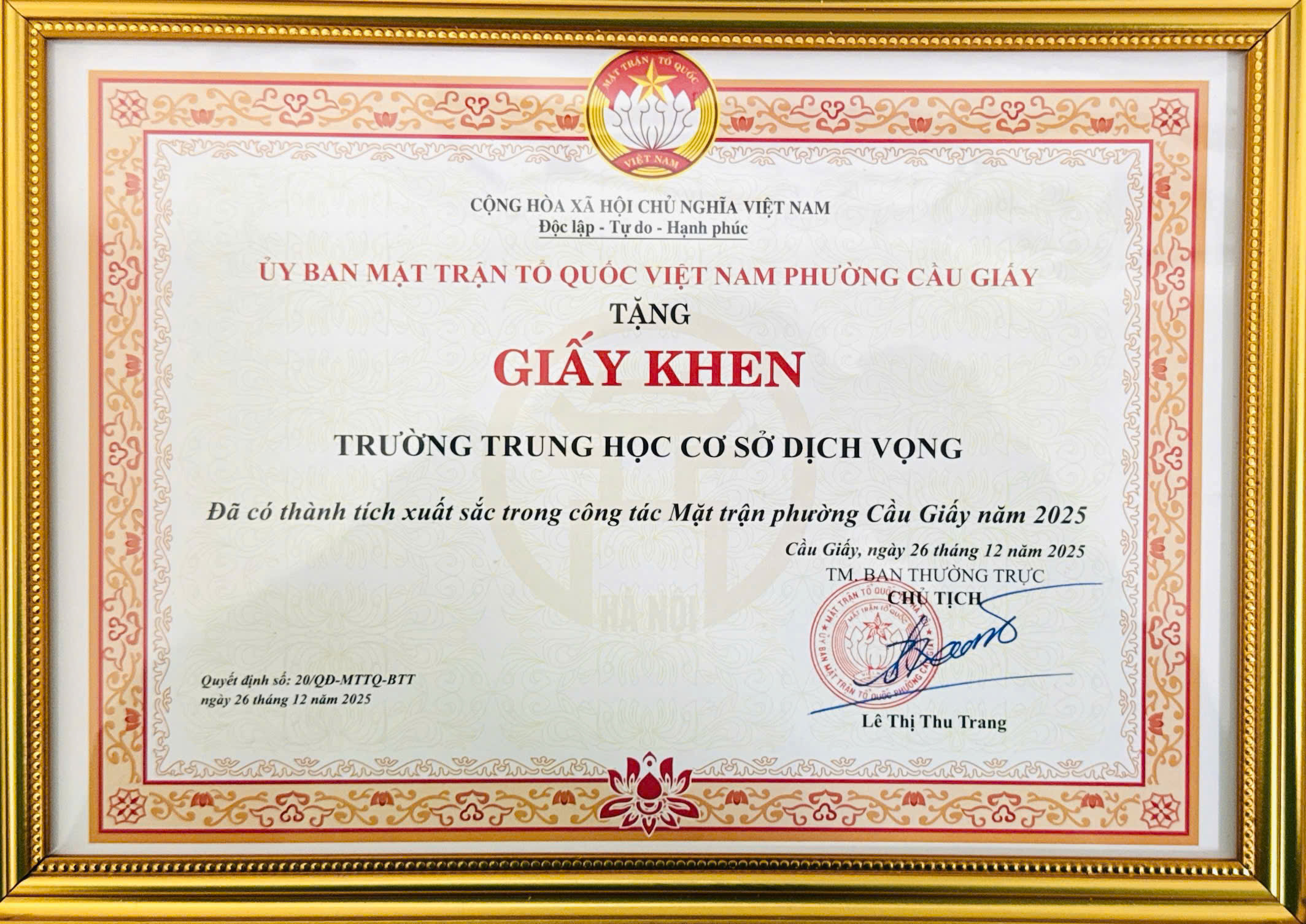 🌺 Những ngày đầu năm 2026, Trường THCS Dịch Vọng vinh dự được Ủy ban Mặt trận Tổ quốc Việt Nam phường Cầu Giấy trao Giấy khen “Đã có thành tích xuất sắc trong công tác Mặt trận phường Cầu Giấy năm 2025”.