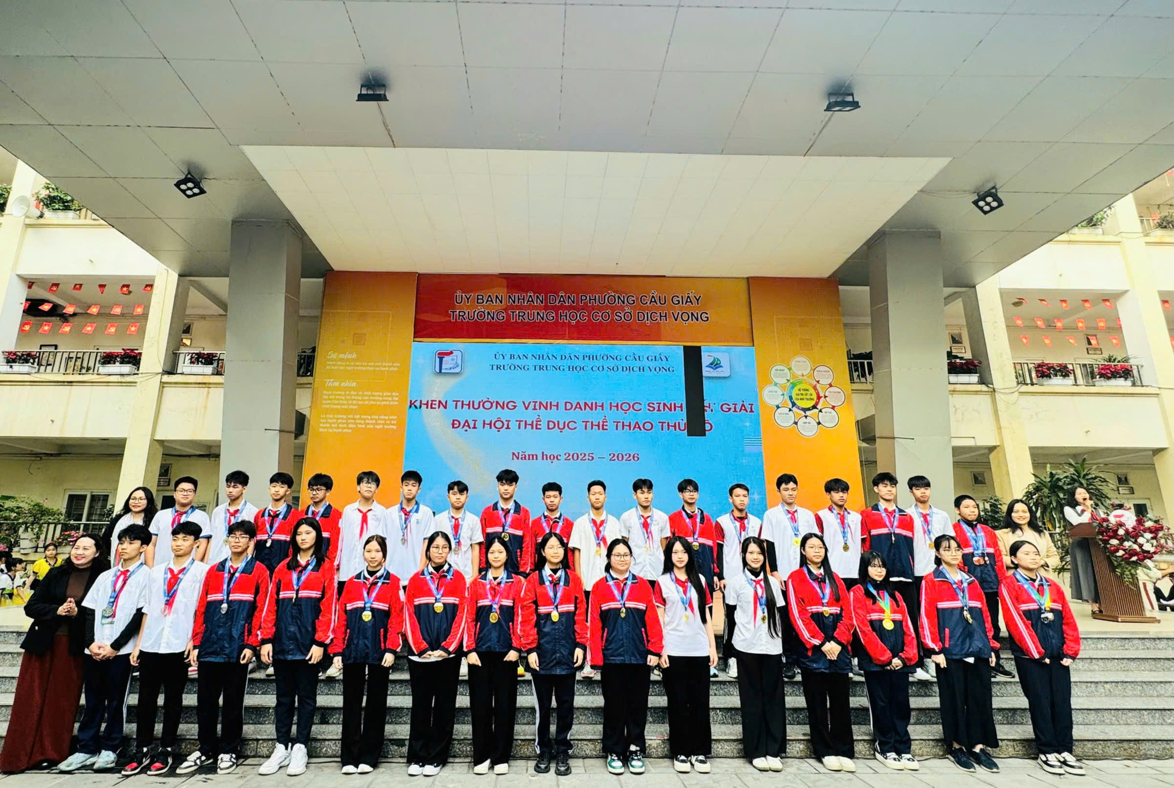 📅 Ngày 15/12/2025, Trường THCS Dịch Vọng đã long trọng tổ chức Lễ khen thưởng vinh danh tập thể lớp, học sinh có thành tích trong thi đua đợt 2 năm học 2025 – 2026 nhằm biểu dương, tôn vinh các tập thể và cá nhân học sinh đạt thành tích xuất sắc trong các lĩnh vực văn hóa, thể dục thể thao, nghệ thuật và hoạt động phong trào. Đây là hoạt động ý nghĩa, góp phần động viên, khích lệ tinh thần học tập, rèn luyện của học sinh, đồng thời khẳng định hiệu quả của công tác giáo dục toàn diện trong năm học 2025 – 2026.