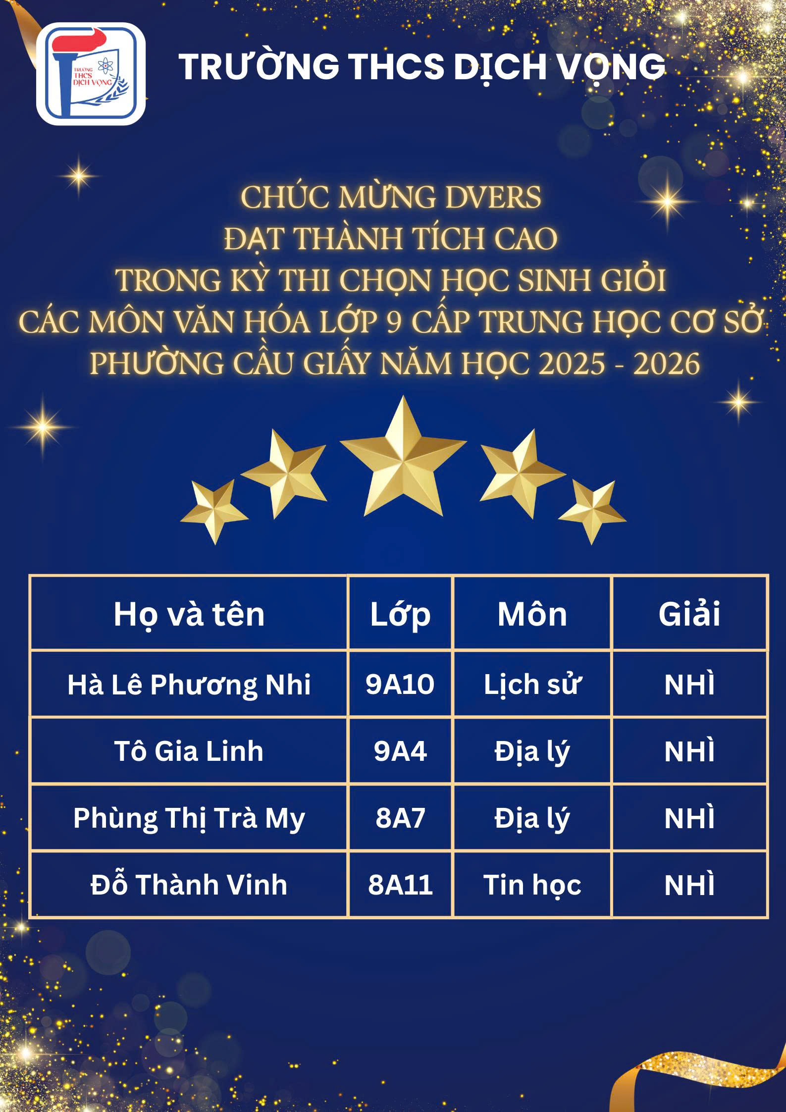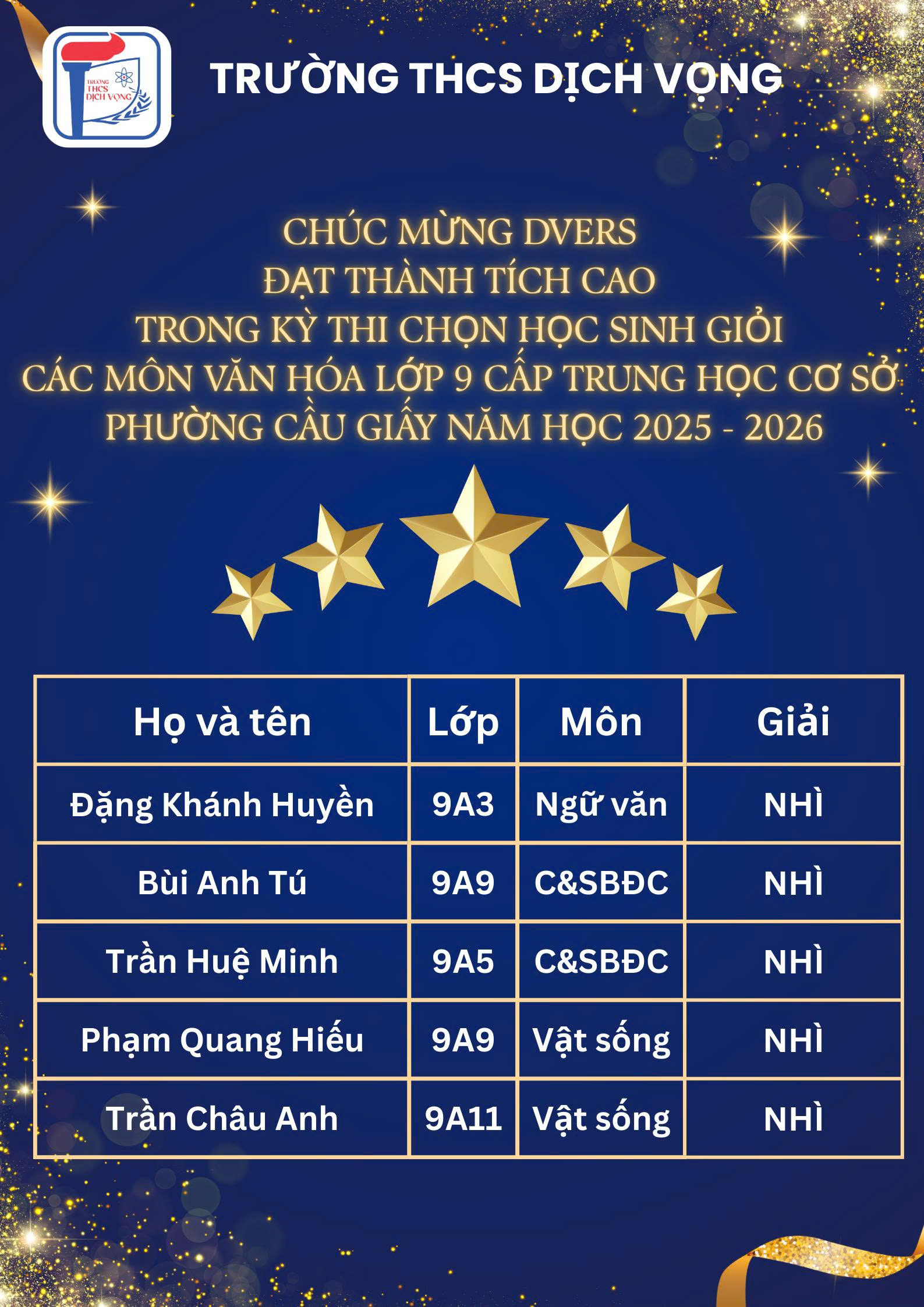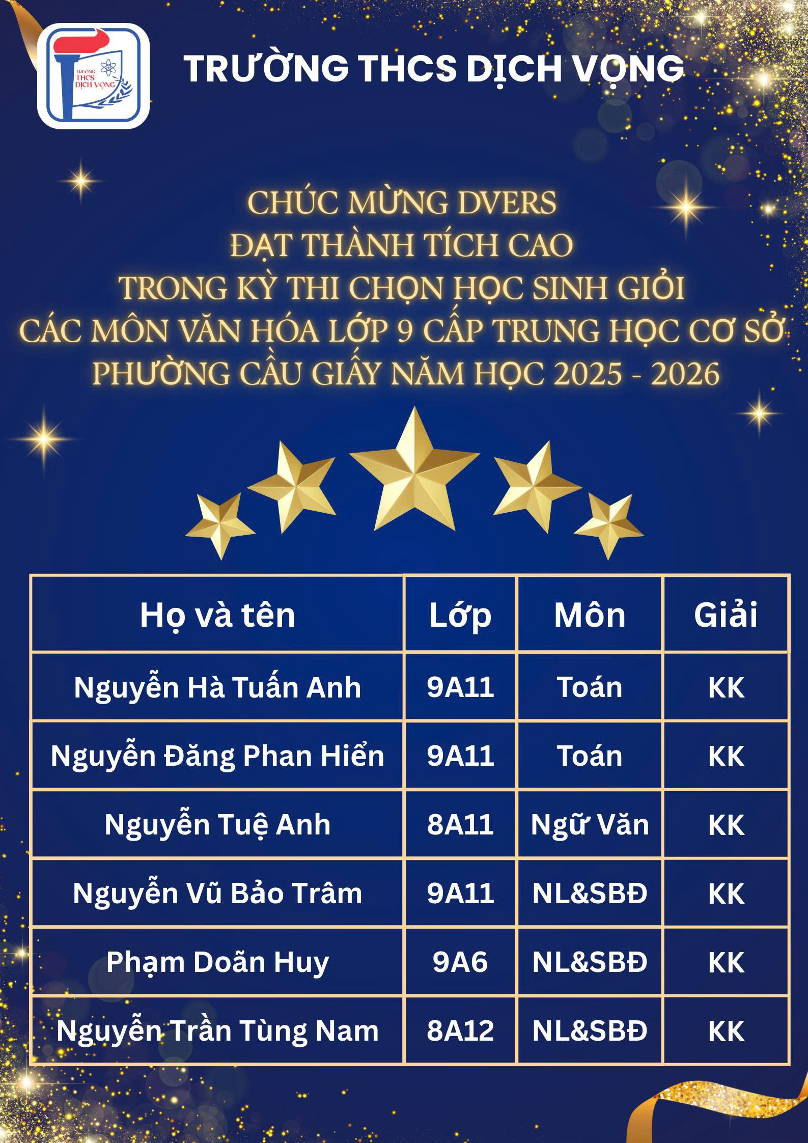 Xin chúc mừng tất cả các em đã mang vinh quang về cho mái trường Dịch Vọng! Mong rằng các em sẽ tiếp tục giữ vững phong độ, chinh phục những đỉnh cao tri thức mới trong Kỳ thi chọn học sinh giỏi Thành phố các môn văn hóa lớp 9 cấp THCS năm học 2025 - 2026 sắp tới!