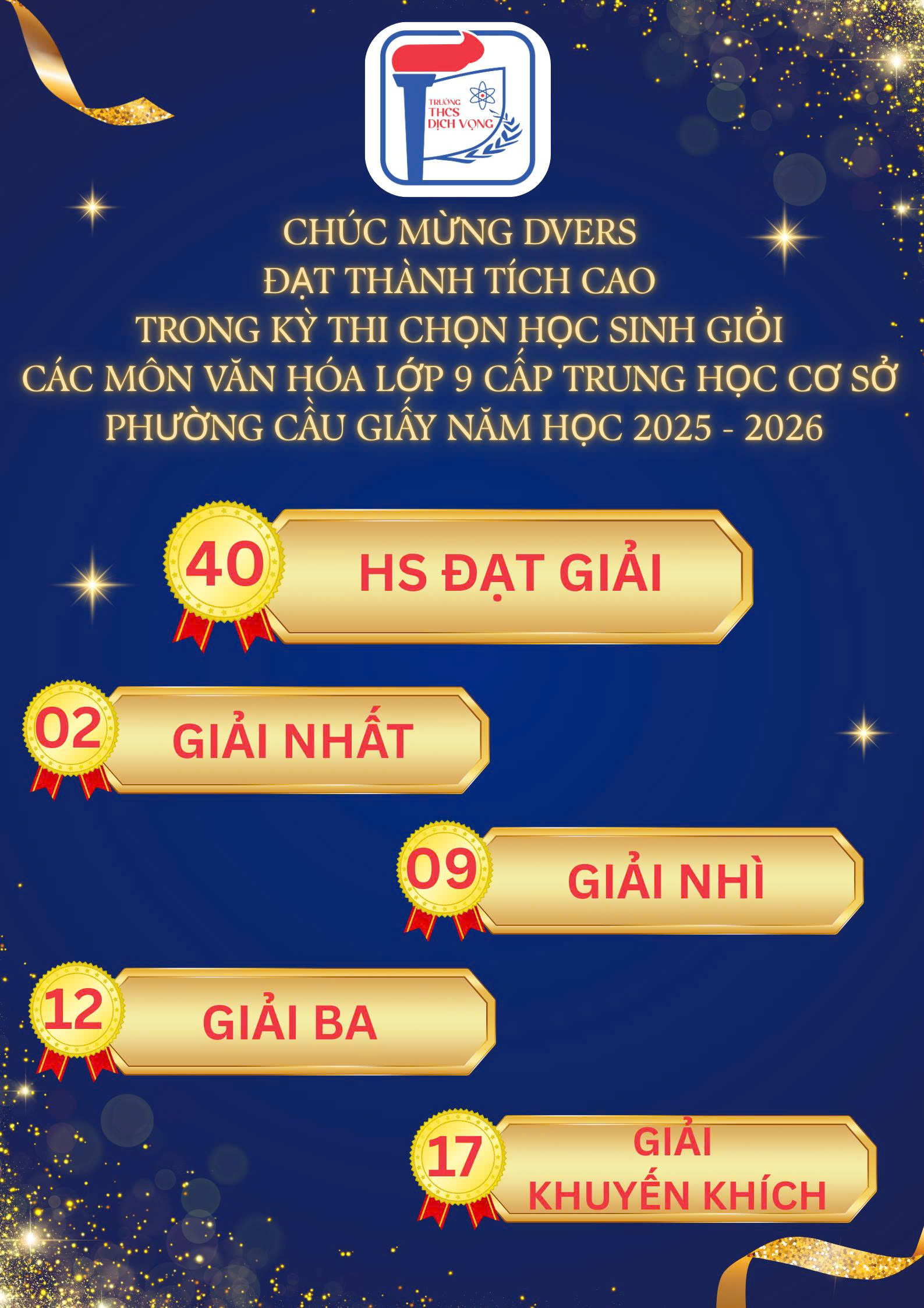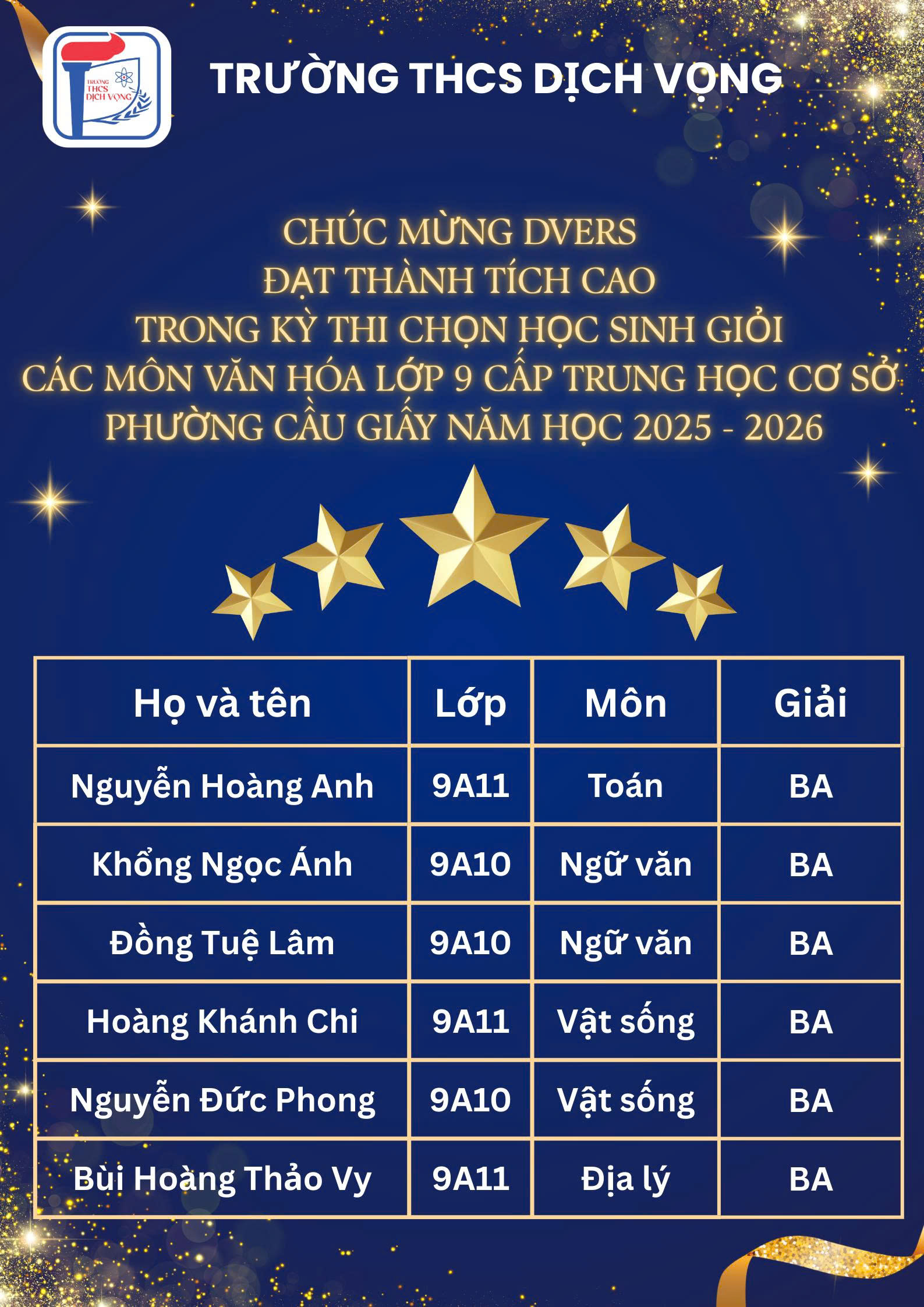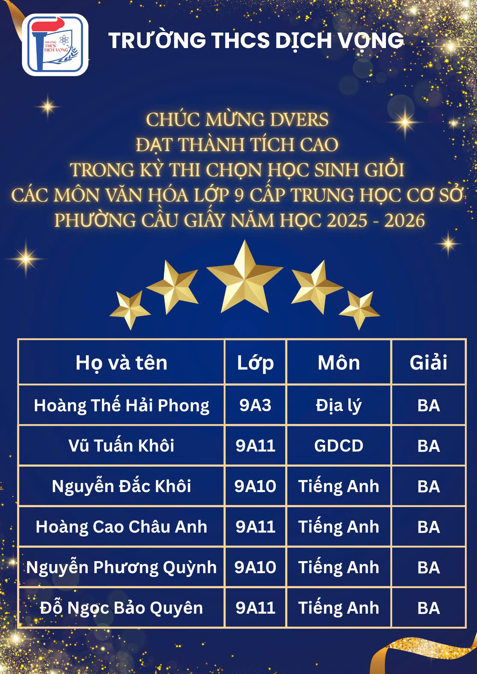 Xin chúc mừng tất cả các em đã mang vinh quang về cho mái trường Dịch Vọng! Mong rằng các em sẽ tiếp tục giữ vững phong độ, chinh phục những đỉnh cao tri thức mới trong Kỳ thi chọn học sinh giỏi Thành phố các môn văn hóa lớp 9 cấp THCS năm học 2025 - 2026 sắp tới!